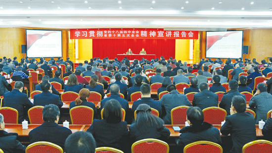 報(bào)告中,時(shí)小云以翔實(shí)的資料、生動(dòng)的語(yǔ)言、透徹的分析,從深刻理解黨的十八屆四中全會(huì)和省委十屆五次全會(huì)主要精神,全面推進(jìn)依法治國(guó)、建設(shè)社會(huì)主義法治國(guó)家,堅(jiān)定不移走中國(guó)特色社會(huì)主義法治之路,全面推進(jìn)依法治國(guó)的重大部署和重大舉措,治黨務(wù)必從嚴(yán)、必須堅(jiān)定不移推進(jìn)等五個(gè)方面,圍繞黨的十八屆四中全會(huì)和省委十屆五次全會(huì)提出的新思想、新觀點(diǎn)、新論斷、新部署,對(duì)全會(huì)精神進(jìn)行了系統(tǒng)闡述和解讀。