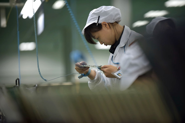 9月24日,在位于四川省綿陽市的四川九洲電子科技股份有限公司,工作人員正在對數(shù)字機頂盒印制板的電子元器件進行插裝。