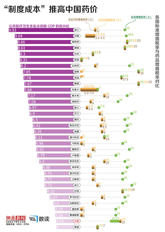 高昂的藥品增值稅也在很大程度上推高了中國(guó)藥價(jià)。經(jīng)合組織健康委員會(huì)和歐洲制藥工業(yè)協(xié)會(huì)聯(lián)合會(huì)(EFPIA)的數(shù)據(jù)顯示,大多數(shù)國(guó)家對(duì)藥品征收的增值稅率非常低,還有一些國(guó)家標(biāo)準(zhǔn)增值稅率雖然較高,但卻對(duì)藥品實(shí)行了減讓。美國(guó)、奧地利、塞浦路斯等國(guó)不對(duì)藥品征收增值稅;英國(guó)、瑞典、澳大利亞等國(guó)處方藥的增值稅率也為0%;荷蘭、法國(guó)、比利時(shí)等國(guó)藥品增值稅率不到標(biāo)準(zhǔn)增值稅率的1/3;而中國(guó)藥品的增值稅率高達(dá)17%,約為歐洲平均值(8.8%)的兩倍。