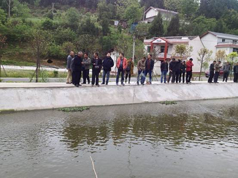 圖為考察團(tuán)在麻秧鄉(xiāng)華騰水產(chǎn)養(yǎng)殖專業(yè)合作社咨詢水產(chǎn)品種引進(jìn)事宜。