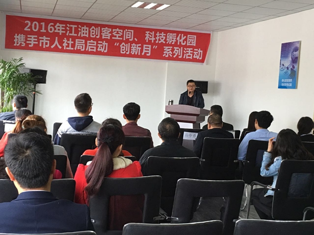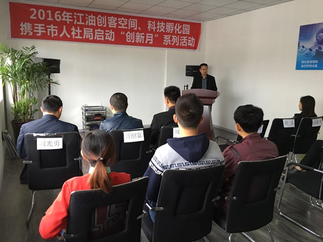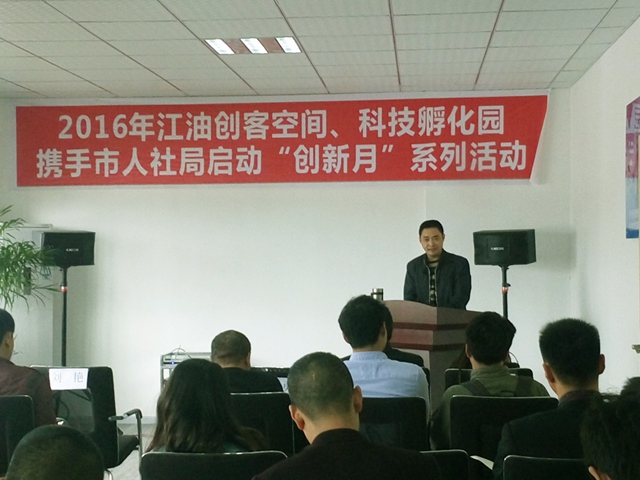 2016年4月8日,江油市創(chuàng)客空間和科技孵化園攜手市人力資源和社會保障局舉辦“創(chuàng)新月”政策培訓(xùn)會,參加培訓(xùn)會的有市人社局人才中心主任蒲益、副主任郭建華、股長蔣紹富、股長劉光勇以及創(chuàng)客空間和科技孵化園的入孵企業(yè),培訓(xùn)會由創(chuàng)客空間經(jīng)理鮮曉波主持。