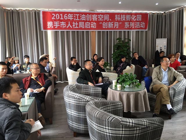 2016年4月19日上午,江油創(chuàng)客空間、科技孵化園聯(lián)合市人社局、青年俱樂(lè)部舉辦入孵企業(yè)路演活動(dòng),參加活動(dòng)的有市人社局就業(yè)局局長(zhǎng)蔣中勇、市人社局人才中心主任蒲益、青年俱樂(lè)部導(dǎo)師強(qiáng)興蓉、導(dǎo)師張菡以及創(chuàng)客空間和科技孵化園入孵企業(yè)10余家,活動(dòng)由創(chuàng)客空間經(jīng)理鮮曉波主持。