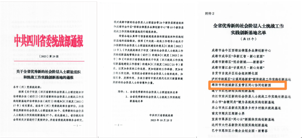 2023年10月25日,中共四川省委統(tǒng)戰(zhàn)部發(fā)布了《關(guān)于全省優(yōu)秀新的社會階層人士聯(lián)誼組織和統(tǒng)戰(zhàn)工作實(shí)踐創(chuàng)新基地的通報》。通報中,科源集團(tuán)運(yùn)營的同心協(xié)同創(chuàng)新園,成為綿陽市唯一一家獲評“全省優(yōu)秀新的社會階層人士統(tǒng)戰(zhàn)工作實(shí)踐創(chuàng)新基地”!